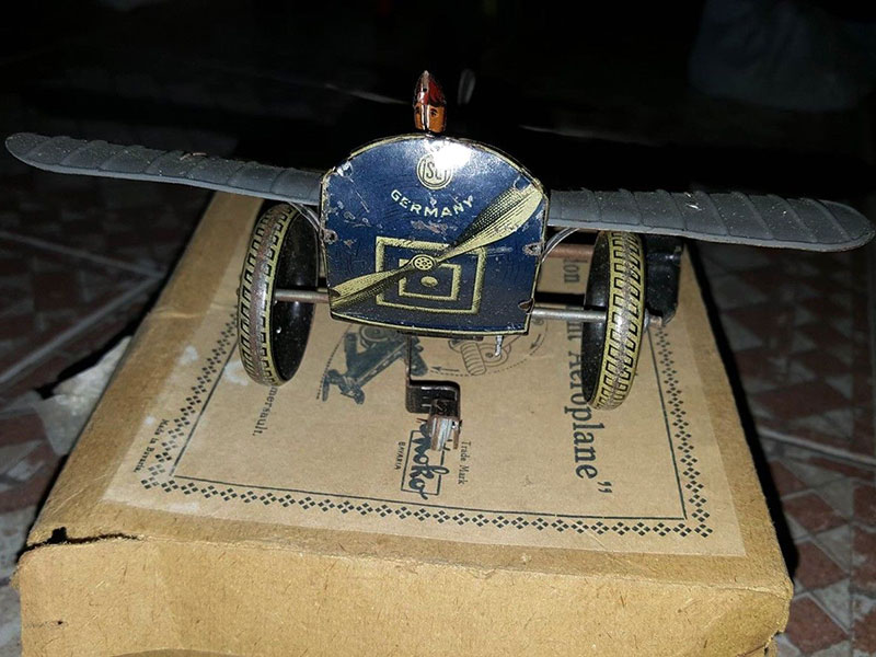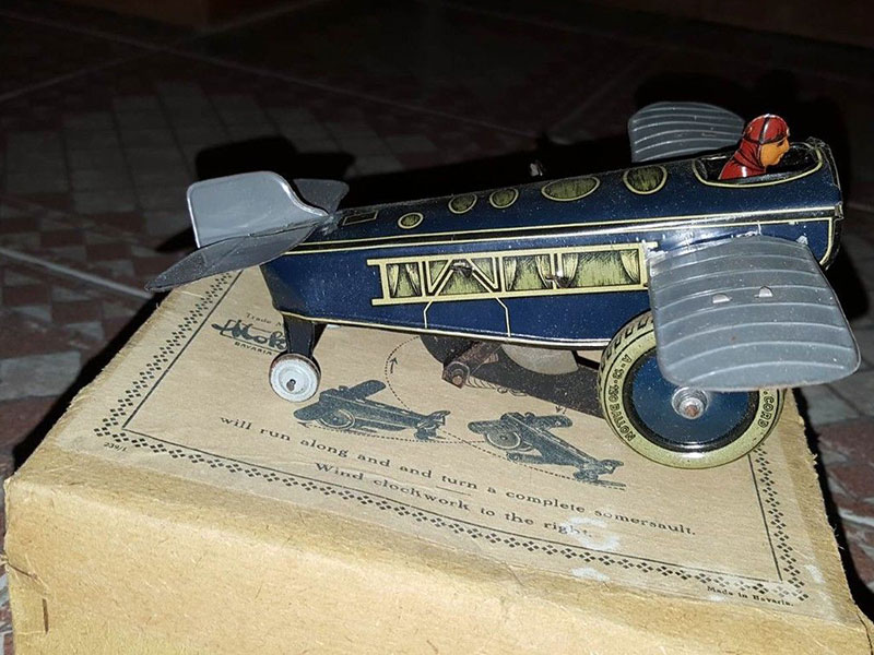 A "Croydon Stunt Monoplane" together with the Original Illustrated Box which It was made in Germany by SG (Gunthermann) for Moko (Moses Kohnstam) during the 1920's. This toys was obviously made for the English market as the name Croydon was the site of London's original aerodrome, plus the Moko company in the U.K. were Gunthermann's English distributors. The wingspan measures just under 20 cms and the fuselage is also around 20 cms. The clockwork motor works well - When you wind it up the toy runs along a flat surface then performs a somersault. It is interesting to note that on the box, it states "Made in Bavaria"- This dates the toy to the immediate Post First World War period as toy manufacturers wanted to avoid the use of "Germany" due to the considerable ill feeling around at the time.