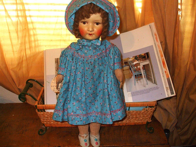 The doll is dressed in a non period home made outfit (not authentic to the doll) and is wearing a pair of crocheted slippers (that look authentic but not sure).