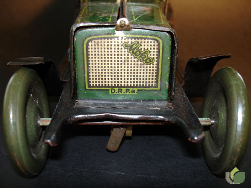 Germany clockwork vehicles 1920 by Moko Top is the double hinged hood that when opened reveals the 6 working cylinders that move up and down when the car is driving along by its clockwork motor. Key wind -key is permanently attached to the toy.9 1/2" long has a driver inside the car,2 doors open and close with tiny attached handles. Has a lever on the drivers side for the gears. Dark Green with Yellow pin stripping. The undercarriage has the litho tail pipe.Toy has forward -neutral -reverse. Very well taken care of- Spring works good- car has a lot of go power! pistons go up & down- doors open & close. WONDERFUL EARLY TIN WORKING TOY.