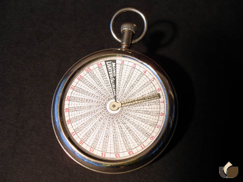 Sehr seltene Rechenuhr "MOKO", Lightning Calculator (Blitzrechner),ab 1915. Mit drehbarem Index auf jeder Seite. Durchmesser 7cm. Hersteller: "M. Kohnstam & Co., Fürth-Bayern". Funktioniert einwandfrei. Gewicht 60g.
