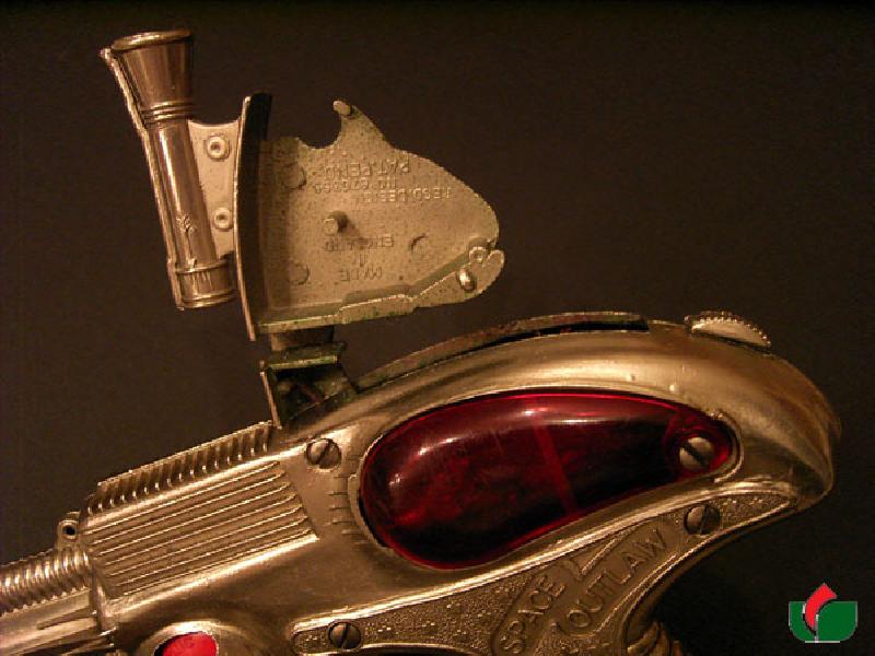 Space Outlaw Atomic Gun with red front sight, Gun is heavier in weight. REGD.DESIGN No 876355.PAT.PEND. MADE IN ENGLAND inside. Dull plated finish.
