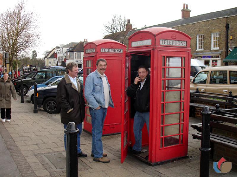 Arno (Mister Winterbutton) and Gerd (the Hamburger) with Marco in the Telephon Boths. Fantastic England Trip 24.-27.Januar 2008 Eppex, Essex